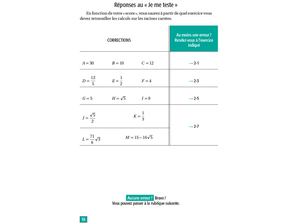 Chaque thème (calcul fractionnaire, racines carrées, puissances...) est composé ainsi :