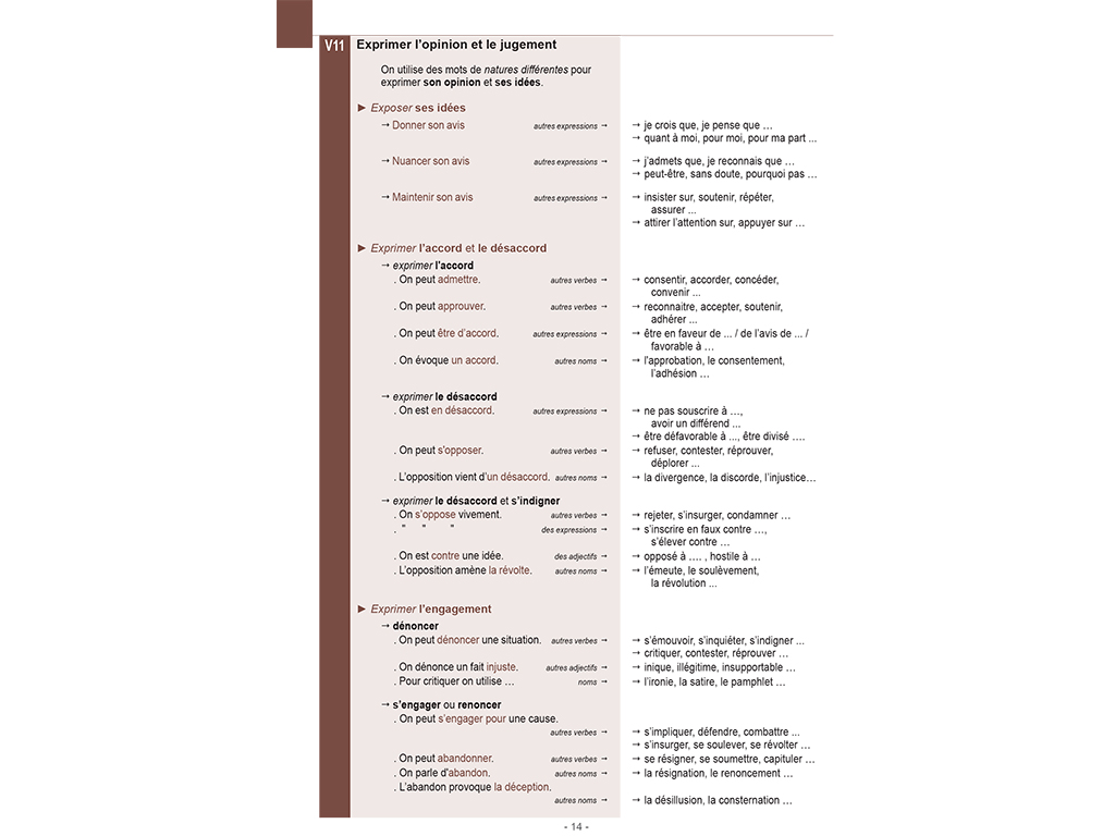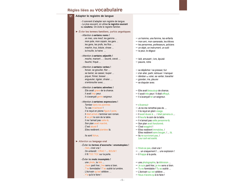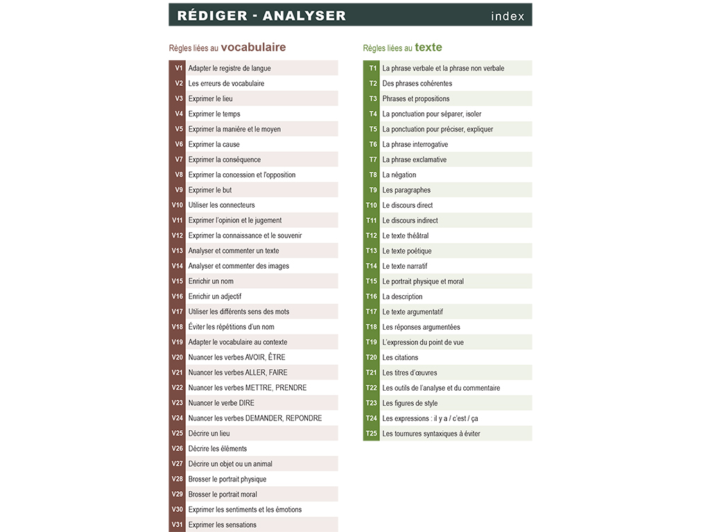 - 31 règles liées au vocabulaire : exprimer un but, utiliser les connecteurs, nuancer des verbes, décrire un lieu, enrichir un adjectif...