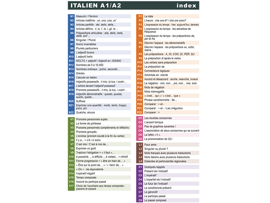 Ce Mémo Italien A1-A2 de 42 pages présente 80 règles et notions essentielles pour maitriser l'italien au collège. Il permet à l'élève de s'auto-corriger et simplifie la tâche de correction du professeur.