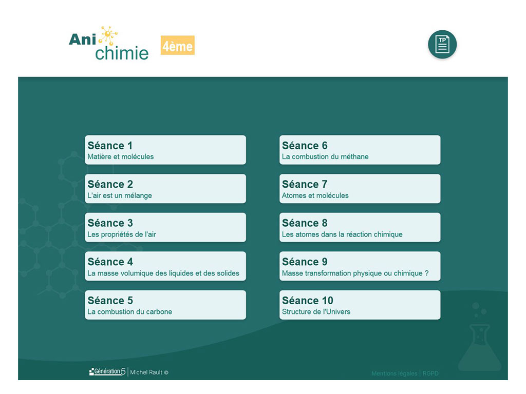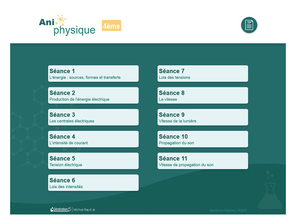 Ces séances permettent de mettre en œuvre le cours avec 88 activités numériques ludiques au travers d'outils de simulation d'expériences.