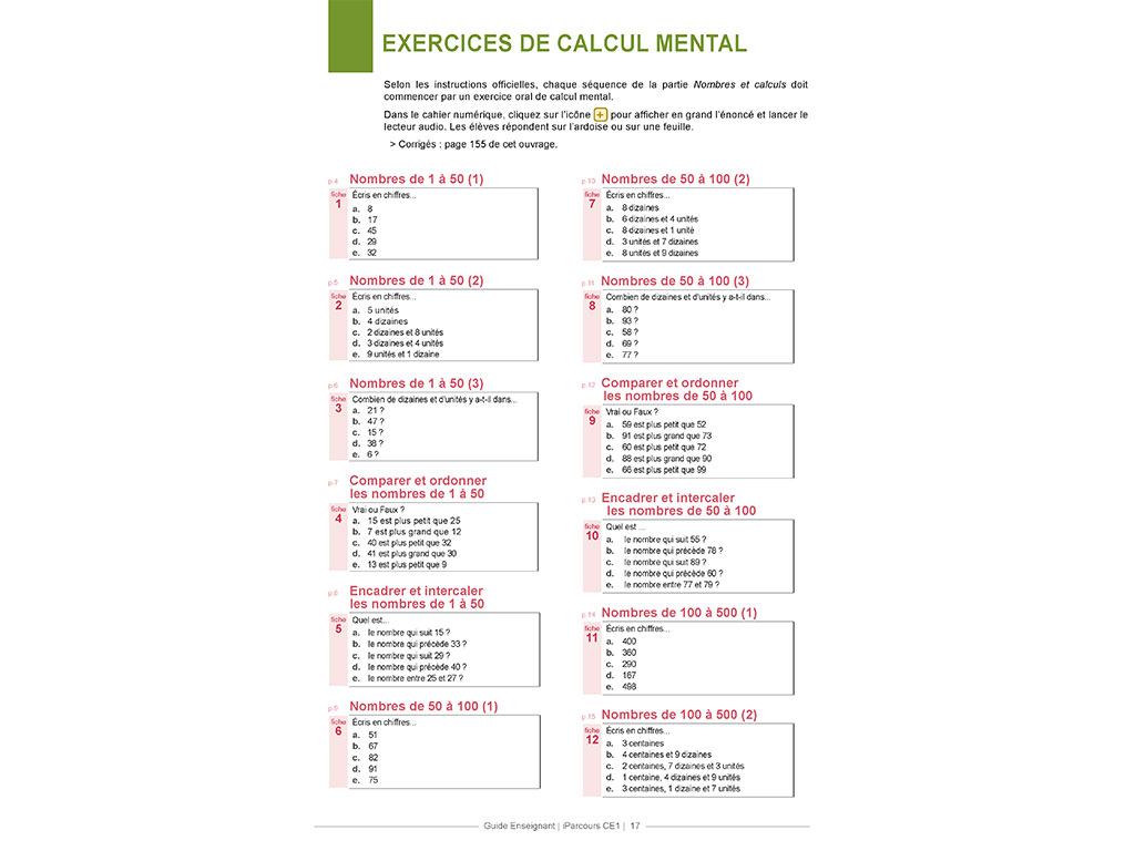 - des énoncés de calcul mental à introduire avant chaque séance de la partie "Nombres et Calculs" ;