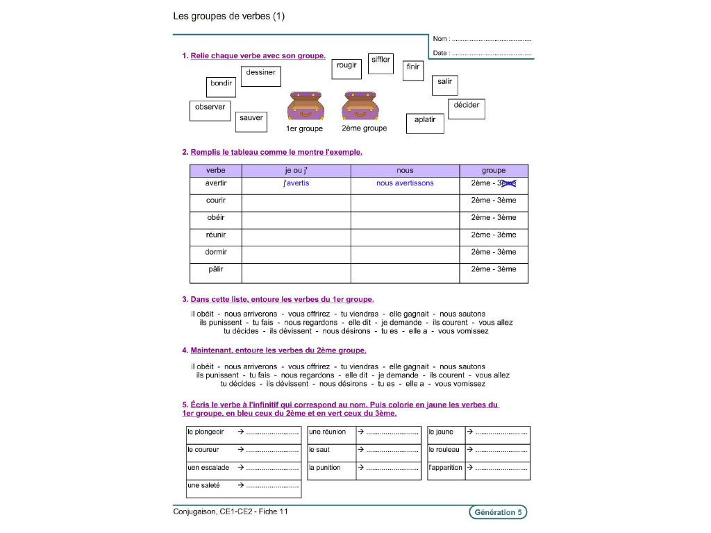 Reconnaître le verbe et le sujet / Connaître l’infinitif et les groupes des verbes / Distinguer le passé, le présent, le futur / Savoir identifier et conjuguer les verbes courants (des 3 groupes) à l’indicatif présent, futur simple, imparfait, passé composé / Maîtriser la conjugaison des verbes être, avoir, aller, faire, dire, venir.